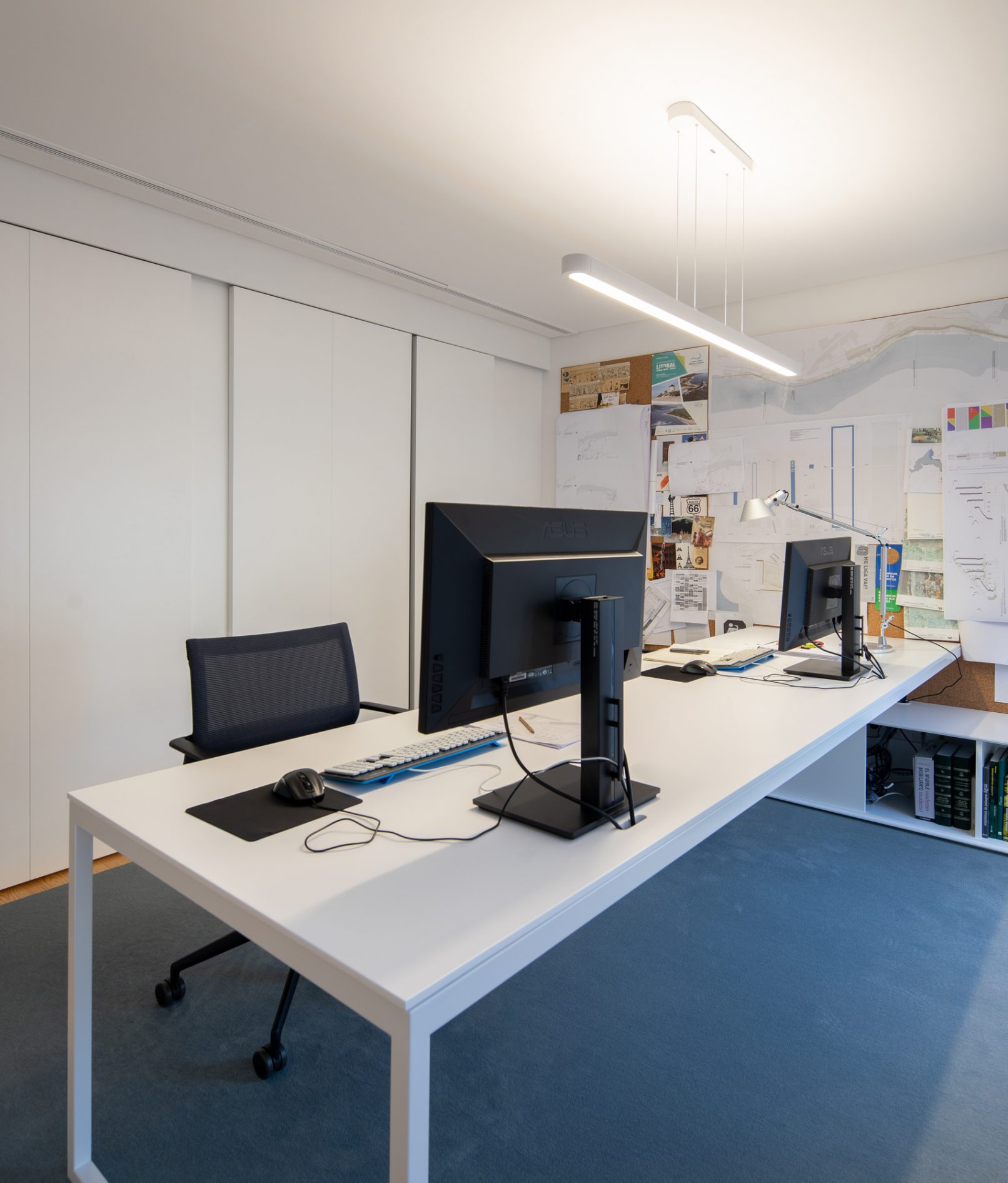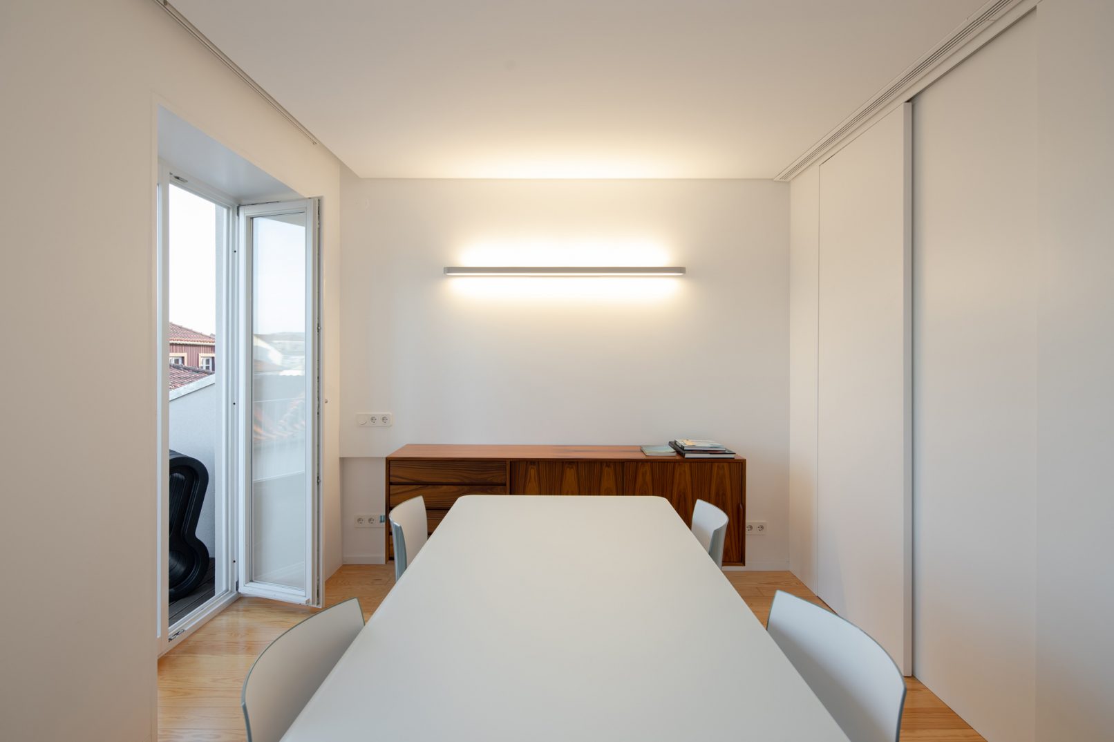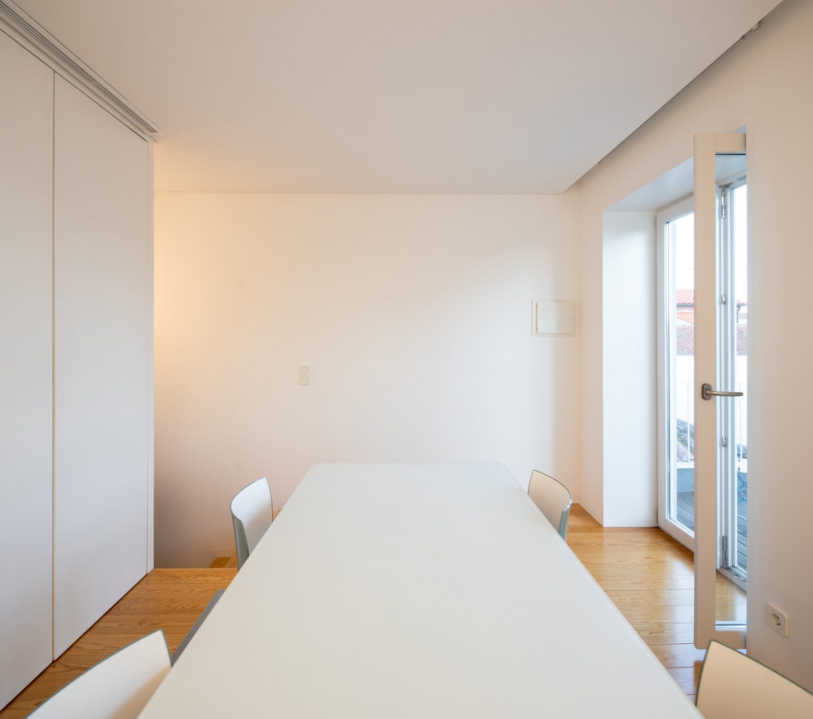 The challenge consisted of merging two small overlapping offices, transforming them into a studio for a landscape architect, with the future possibility of being used for housing. The limited space available obliged to an exercise of the constant economy of space, associated with constructive details that did not introduce any “noise” over the space and reduce it. The spans of the exterior facade facing south were enlarged, gaining enormous sunlight. Therefore, the use of coatings in light shades. On the upper floor, the meeting room extends to a new balcony that takes advantage of the atelier’s excellent location. The interior changes “extended” to the outside, with the improvement of the common areas of the building and especially the facade, searching for a coherence that was not registered initially.