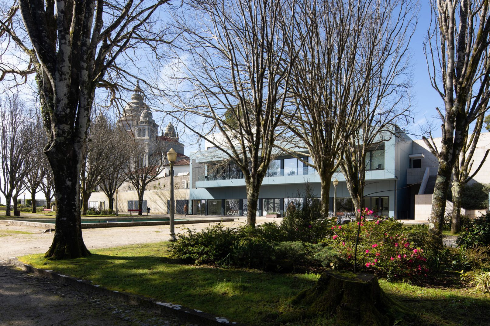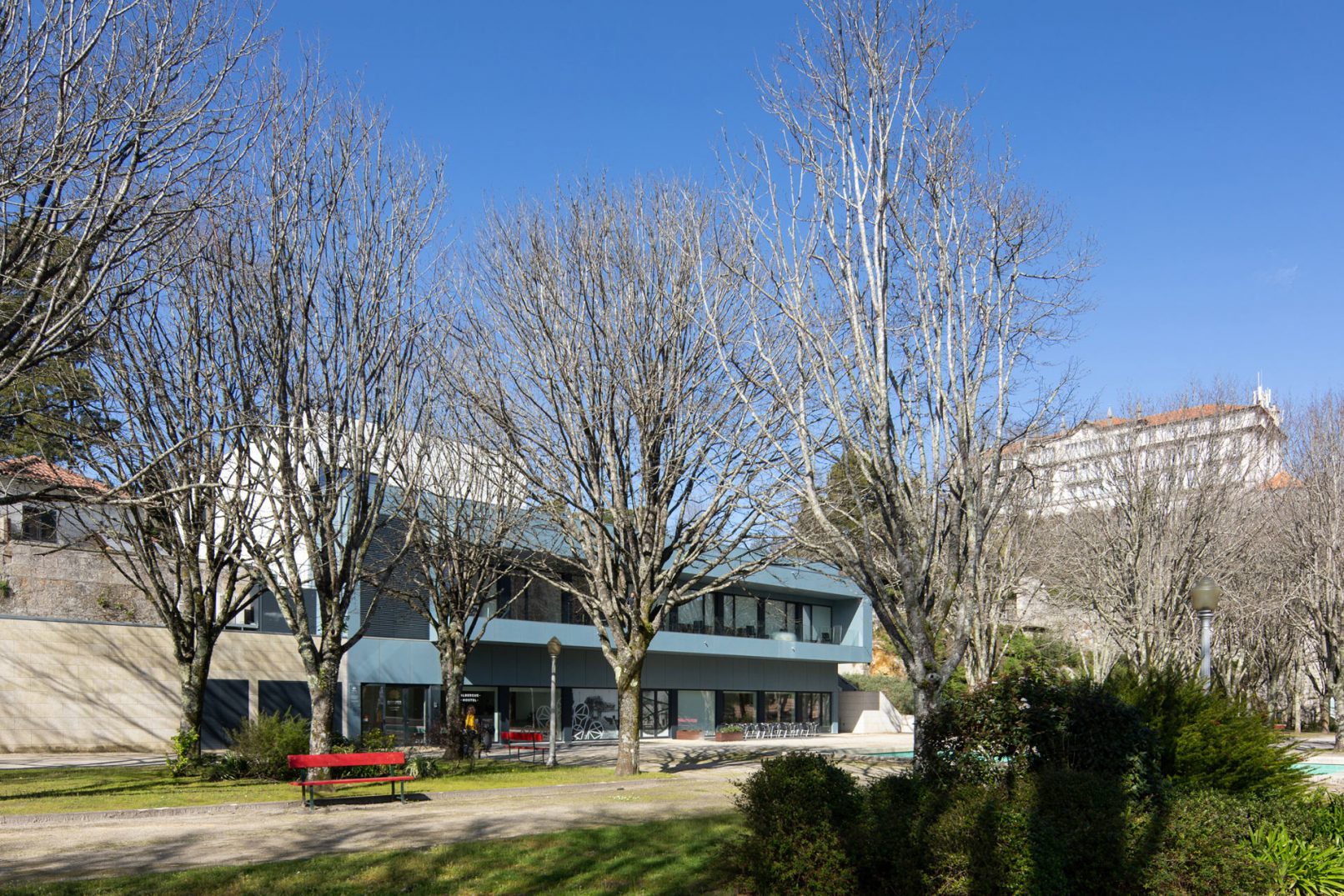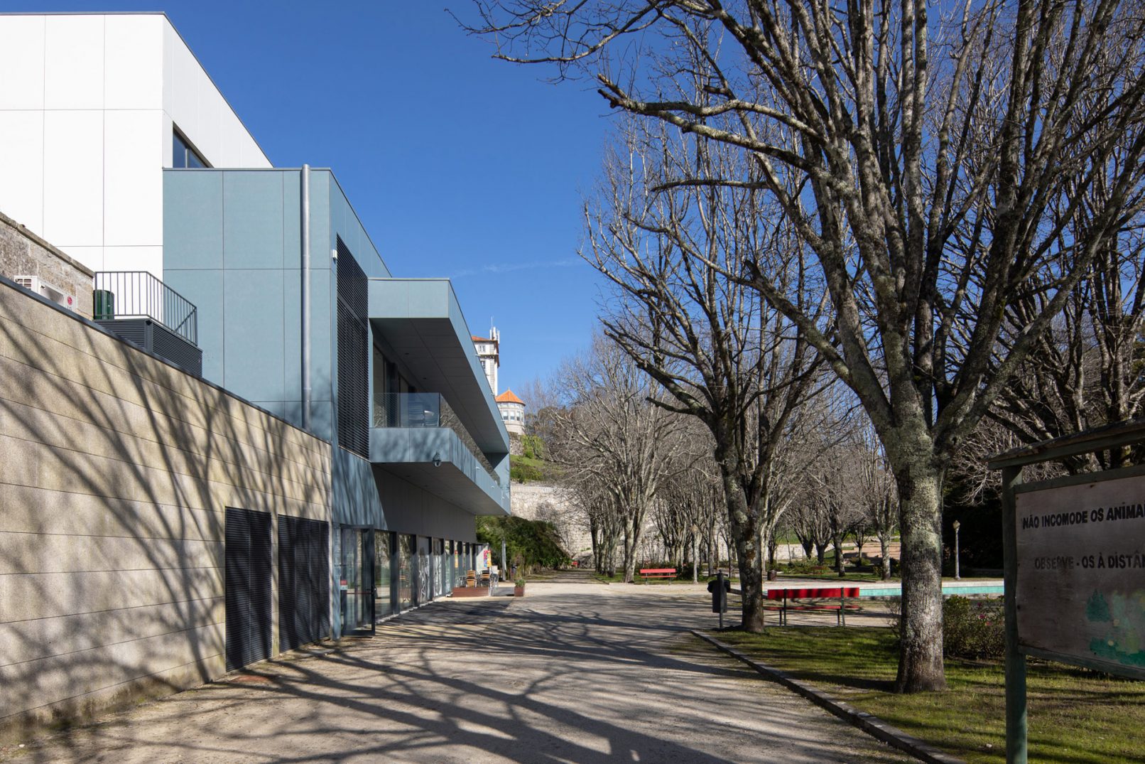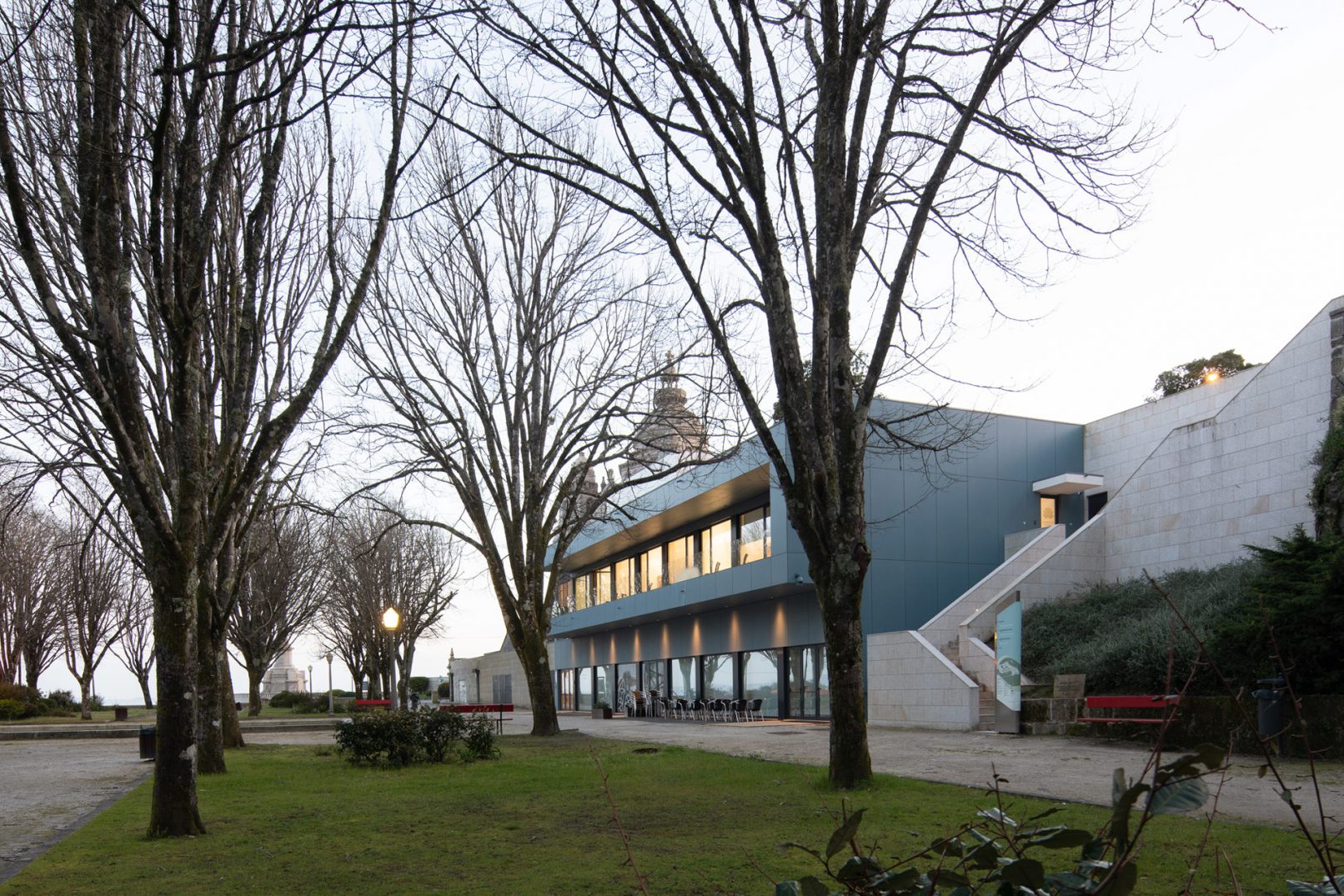 In the location for which the Landscape Architect Faria da Costa designed in 1938 a ground floor cafe/restaurant that was never built, appears the building Edifício das Tílias. This facility belongs to the Sanctuary’s brotherhood Confraria de Santa Luzia, consisting of accommodation spaces, services and cultural activities. On its three floors, there is a museum exhibition space, the brotherhood’s archive, a bar/restaurant, a hostel with a capacity for 38 and several support facilities for the Sanctuary. Formally, the construction, attached to the rocky massif, is related to the “clearing” marked by the pre-existence of a water mirror. It aimed to consolidate the revitalization of the garden Jardim das Tílias, establishing a volumetric and functional relationship between its various levels. The coating, predominantly greenish-gray, merges with the crown of the trees and is related to the granite shade of the surroundings.