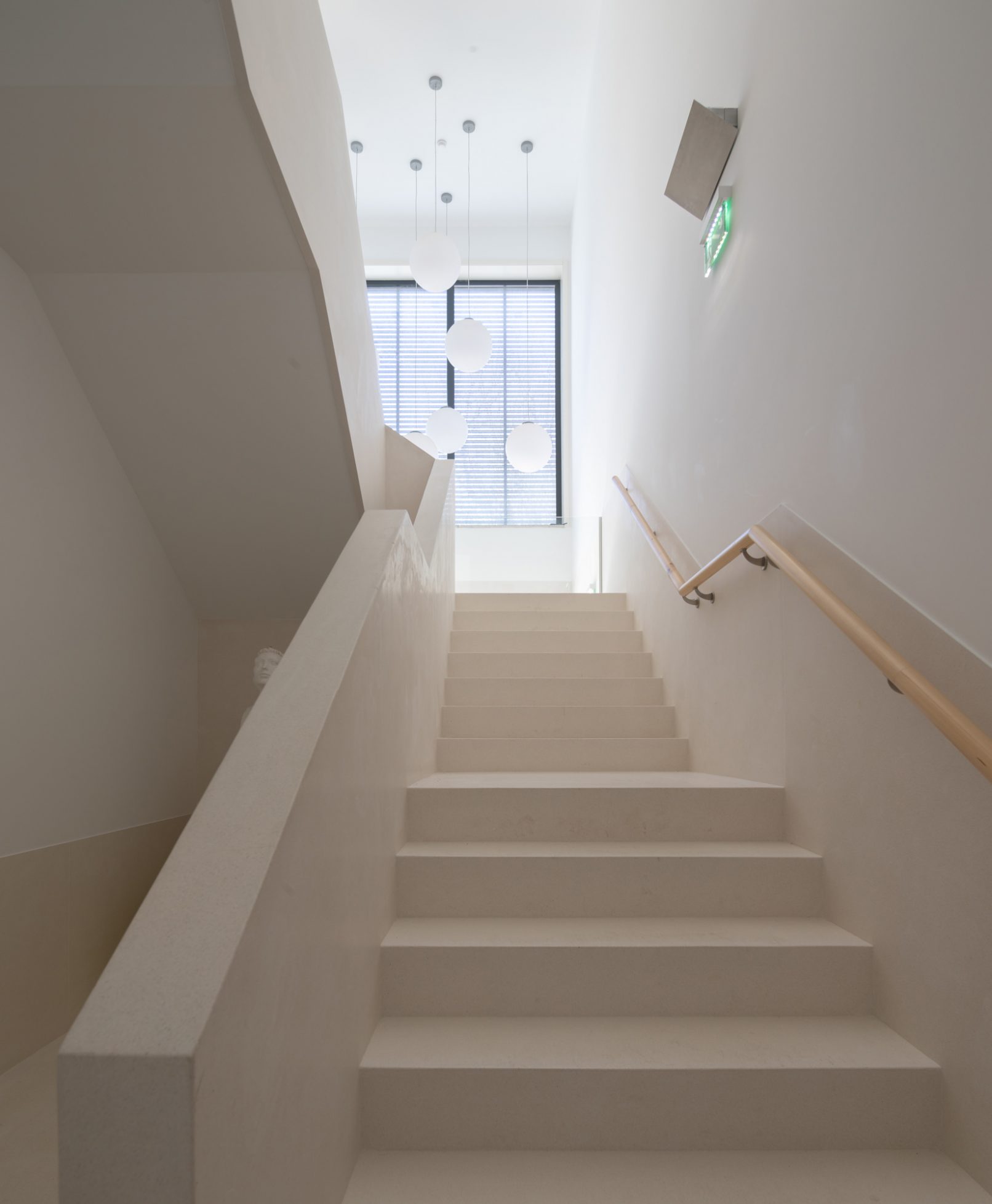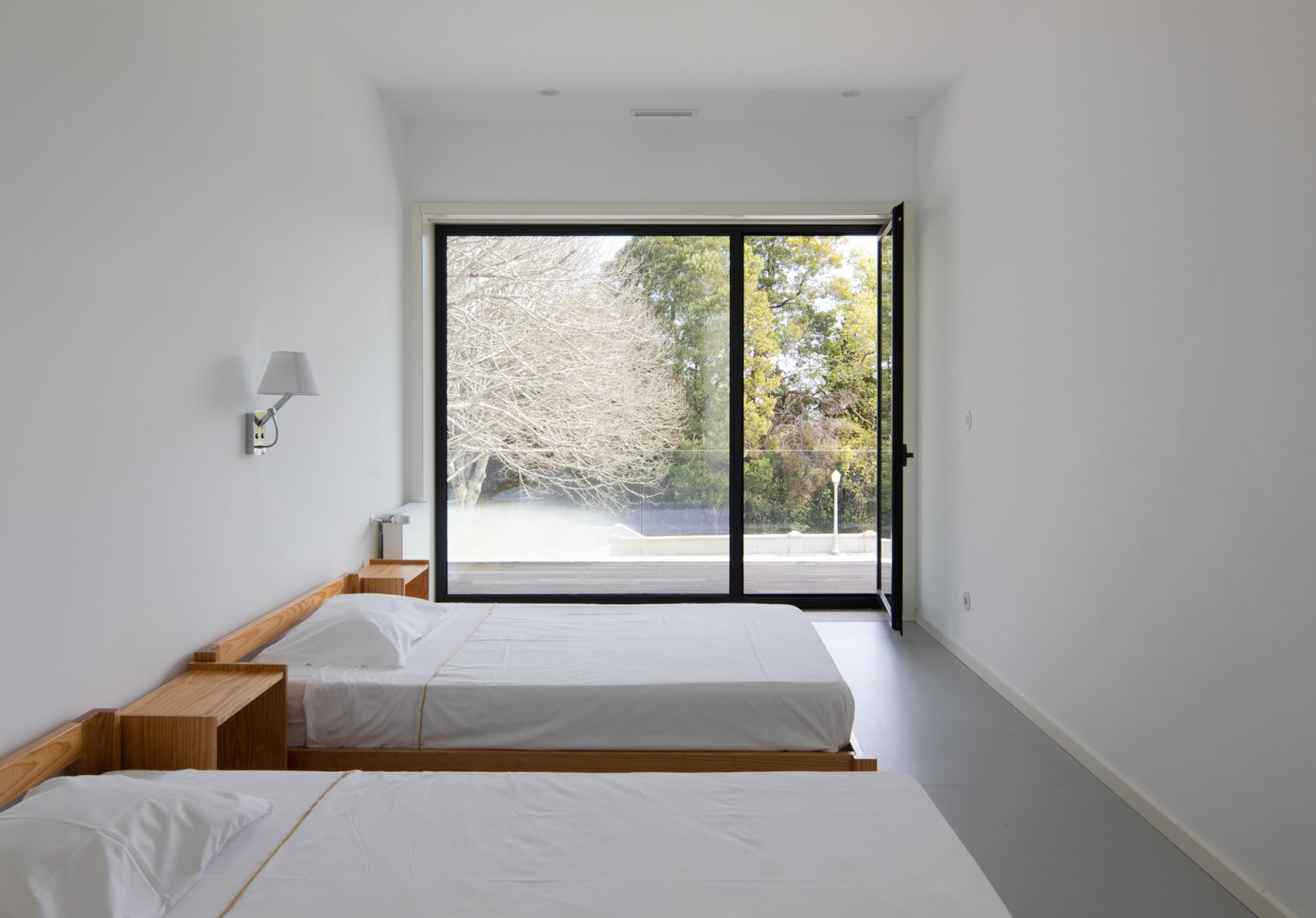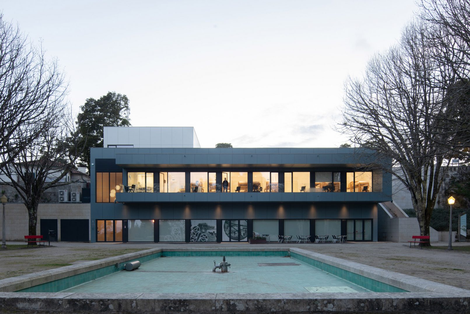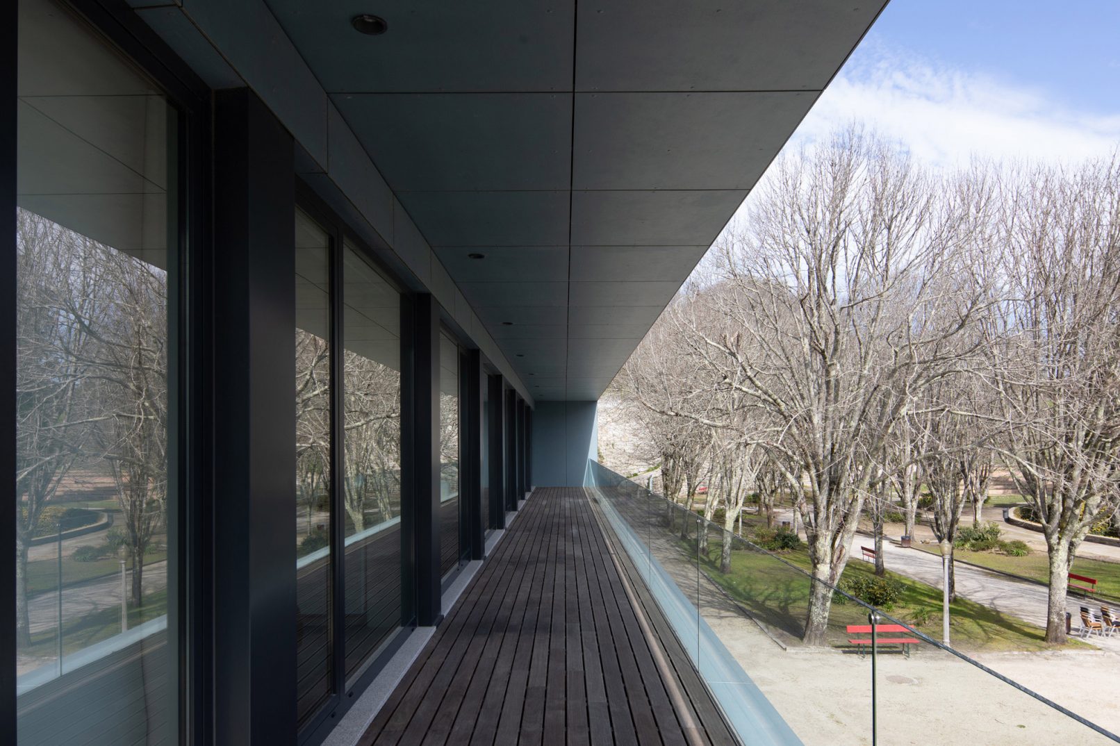 In the location for which the Landscape Architect Faria da Costa designed in 1938 a ground floor cafe/restaurant that was never built, appears the building Edifício das Tílias. This facility belongs to the Sanctuary’s brotherhood Confraria de Santa Luzia, consisting of accommodation spaces, services and cultural activities. On its three floors, there is a museum exhibition space, the brotherhood’s archive, a bar/restaurant, a hostel with a capacity for 38 and several support facilities for the Sanctuary. Formally, the construction, attached to the rocky massif, is related to the “clearing” marked by the pre-existence of a water mirror. It aimed to consolidate the revitalization of the garden Jardim das Tílias, establishing a volumetric and functional relationship between its various levels. The coating, predominantly greenish-gray, merges with the crown of the trees and is related to the granite shade of the surroundings.