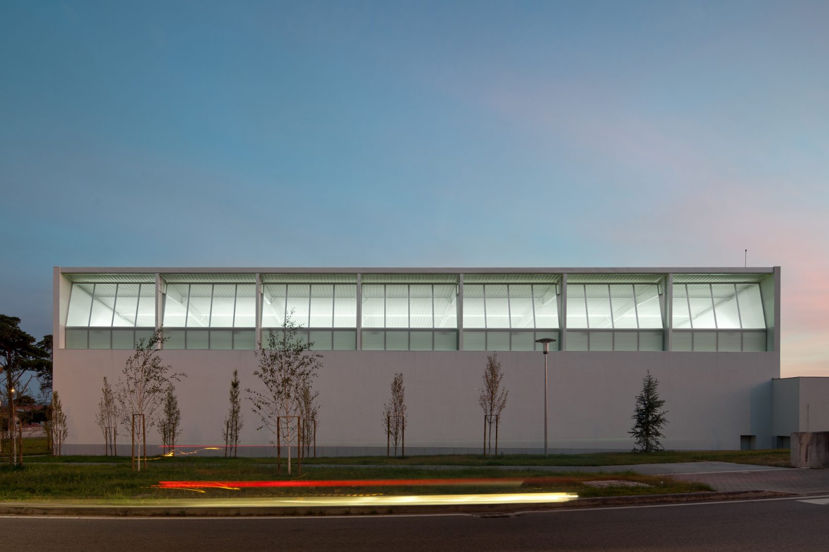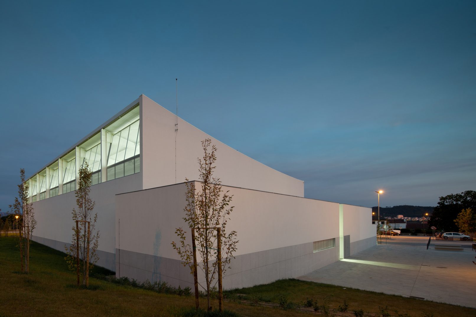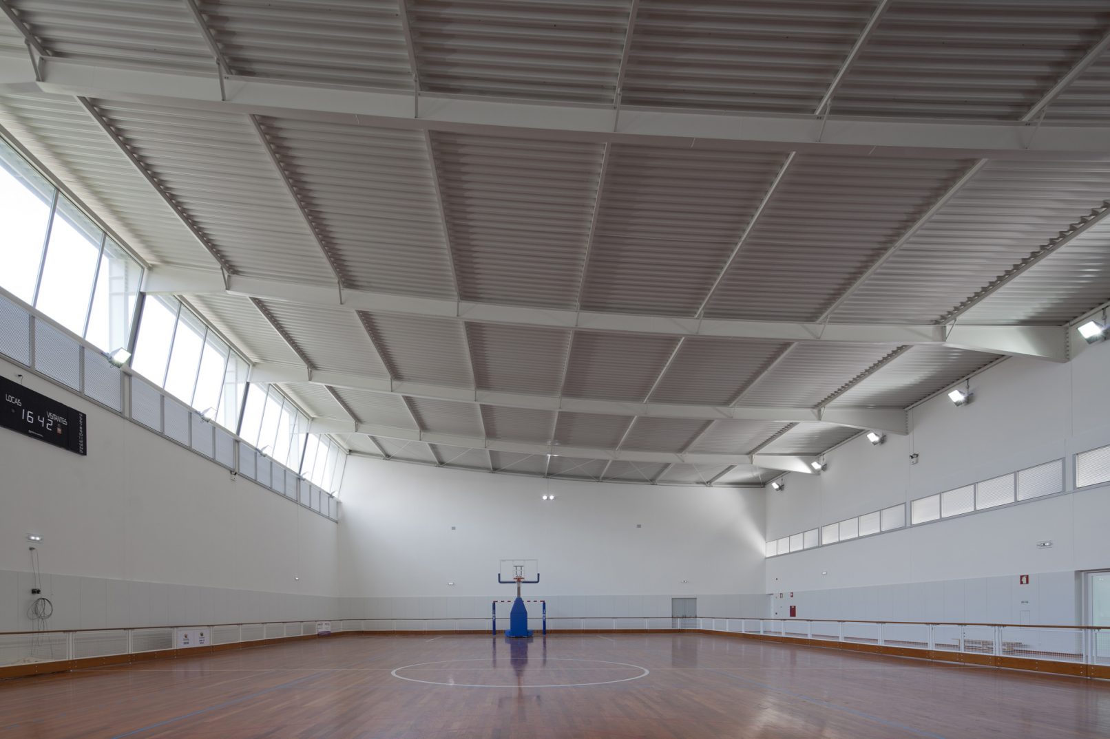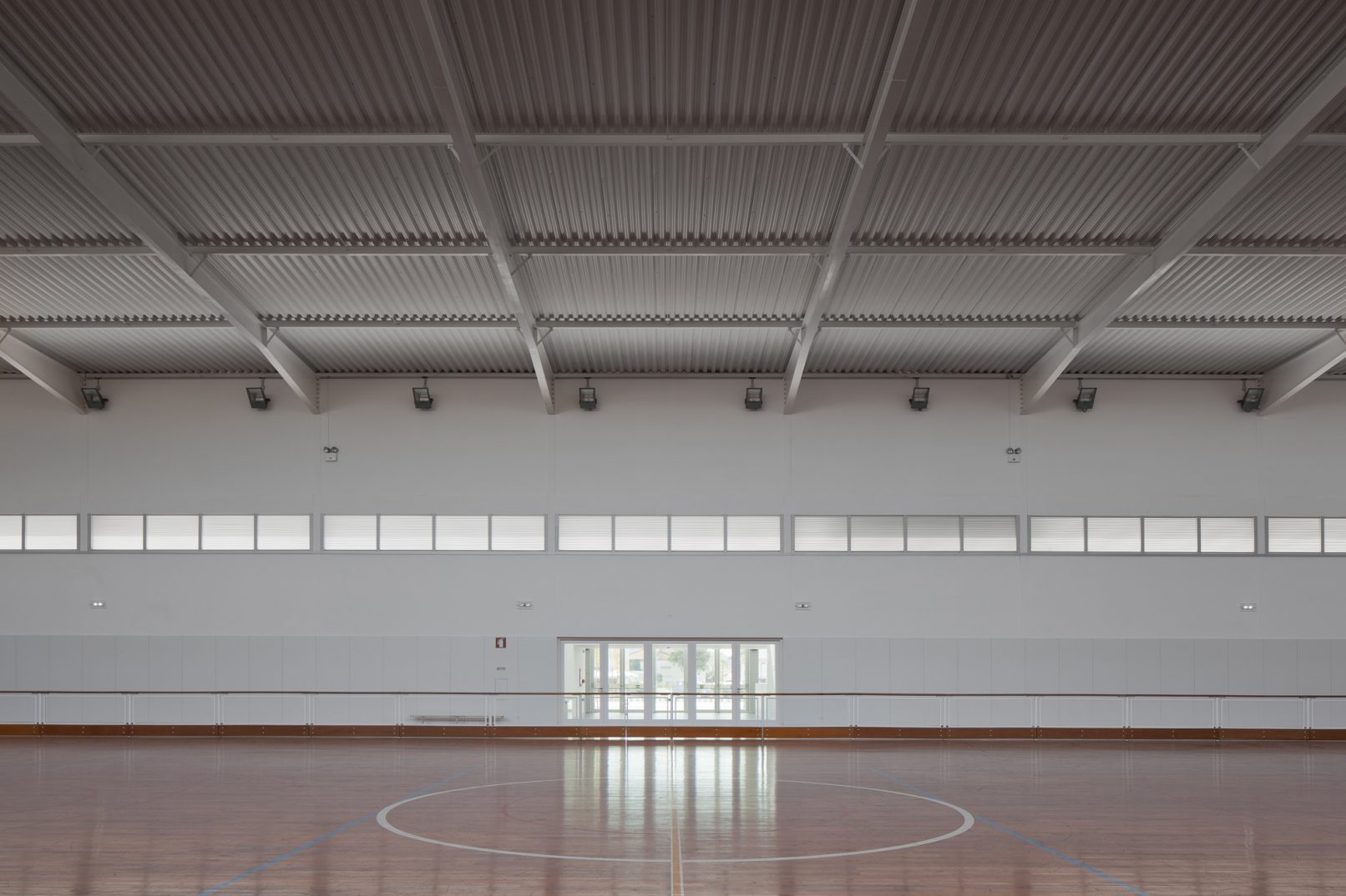 This facility integrates an urban study that articulates a pre-existing Primary School and a Kindergarten, already built, organized around a single public access space. In addition to the main entrance, the facility also faces to the south, the interior distribution galleries, while to the north is the largest volume, the sports grounds, naturally lit and ventilated. To reduce the volumetric impact of the construction on the lower level of the surrounding, the metallic roof of the sports grounds draws a subtle curved line, which creates a single slope with a south-facing pendant, opening to the north wide glazing that illuminates the game area. This results in a dynamic, white and opaque volumetry, in which the entrance area stands out due to the use of polychromatic panels.